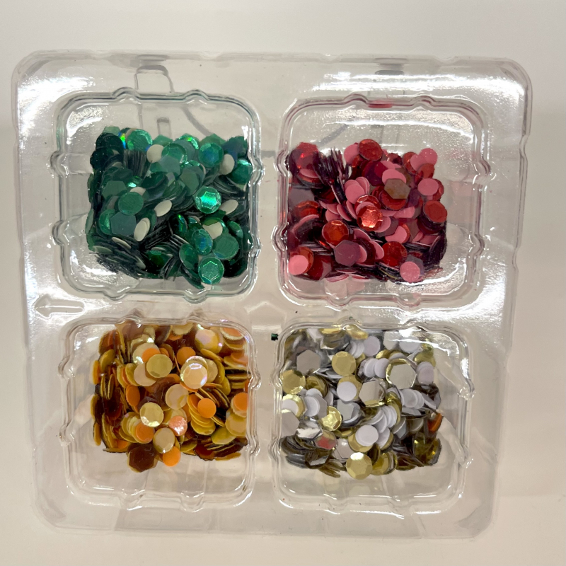 Sie bekommen Pailletten sortiert in 4 Farbenmischungen z.B. für Schüttelkarten