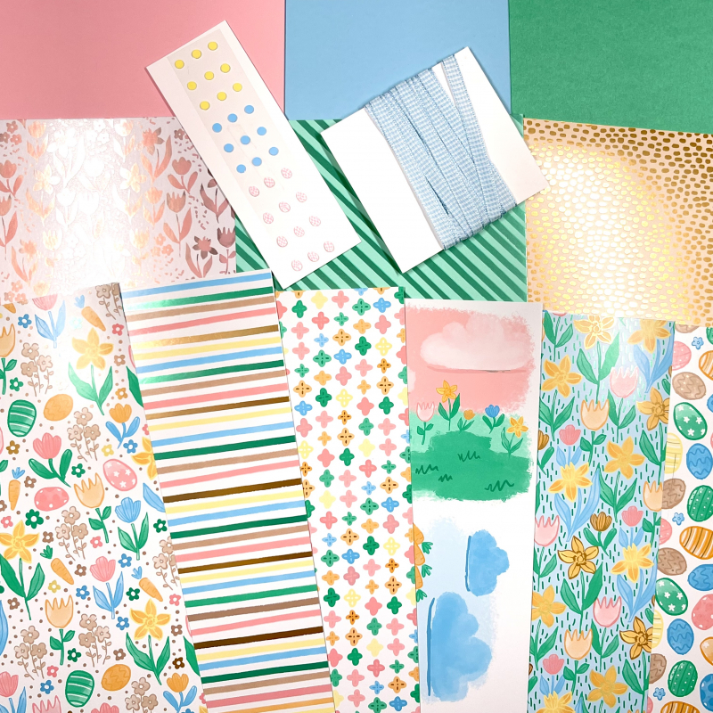 • 12 Blatt Farbkarton A4 (je 4 Blatt in Rosé, Babyblau, Glücksgrün)