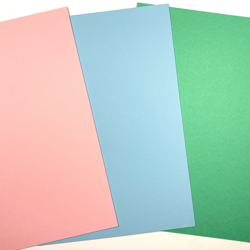 • 18 Blatt Farbkarton A4 (je 6 Blatt in Rosé, Babyblau, Glücksgrün)